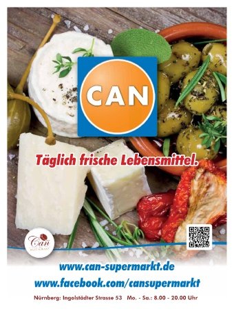 Täglich frische Lebensmittel. www.can-supermarkt.de www.facebook.com/cansupermarkt Nürnberg: Ingolstädter Strasse 53 Mo. - Sa.: 8.00 - 20.00 Uhr